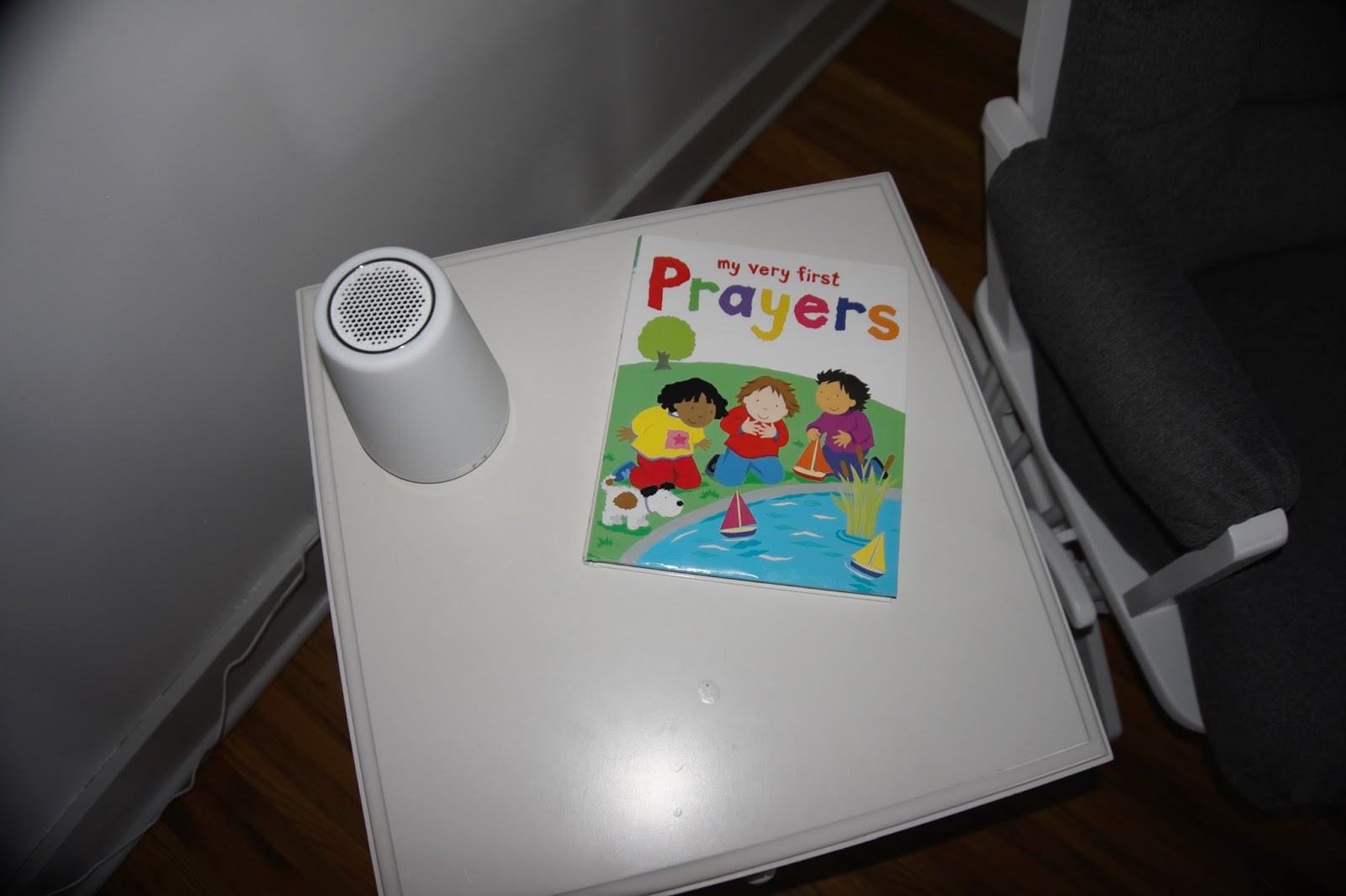 Another shot of the glider. I plan to keep some breastfeeding essentials in that little side table and then his night light/sound machine is on top with a book of prayers.